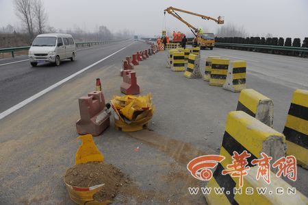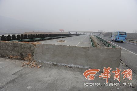 昨日上午,記者乘車從藍田東收費站進入滬陜高速前往西安方向,沒走多遠就看到一溜塑料隔離墩引導著車輛向右行駛。隔離區域內,十余名工人正在吊裝安放水泥隔離墩,而高速路的正前方,則是用磚塊砌起來一堵墻,橫跨整個路面,整個墻上沒有任何交通標識。鄒鐵琴指著已經被抹上一層水泥的墻體說:“這就是我們那天撞上去的,這是剛剛補上的。”記者目測了一下,墻的高度在1.2米左右。一現場指揮的工作人員稱,被墻堵住的路是西商二線,由于工程沒有完工,所以將道路堵住。