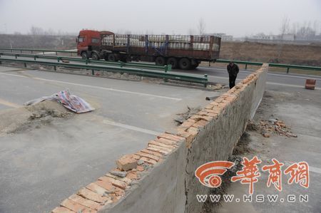 滬陜高速西藍段路,用磚塊砌起來的一堵墻,橫跨整個路面,整個墻上沒有任何交通標識。一輛行駛中的越野車一頭撞上這堵墻,車上一人重傷。