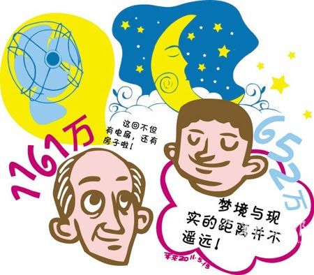 俗話說“有心栽花花不成,無心插柳柳成蔭”,購彩過程往往也如是,精心選擇的號碼不一定中獎,偶爾或隨意選的號卻往往帶來意外驚喜;有些人為中獎殫精竭慮一無所獲,也有些人稀里糊涂地就被大獎砸中了。 原想要臺電扇卻得了1100萬 江蘇省體彩為了回饋彩民而開展“買大樂透送電扇”的活動,無錫的張大爺就是沖著電扇買了一張12元的復(fù)式票,然后再用剩余的3元錢又買了一注追加票。結(jié)果,這個“無心插柳”舉動的結(jié)果是:張大爺電扇沒中到,卻一舉中得大樂透11049期頭獎,獎金高達1161萬元。 張大爺已經(jīng)買了好幾年彩票,但每次數(shù)額都不大,從沒有超過10元錢,更別說什么復(fù)式票了。不過眼下的買大樂透送電扇活動還是挺吸引張大爺?shù)模灰I6碼的復(fù)式票就有機會中臺電扇。“不就是多加幾塊錢嗎?正好夏天也來了,中臺電扇還是不錯的。”張大爺原本只是抱著這樣的想法。 4月30日這天,他獨自一人來到了02777銷售站點,在仔細(xì)咨詢過之后,掏出了15塊錢,打了一張最小的6碼的12元復(fù)式票。 這張復(fù)式票很快就被打了出來,遺憾的是序列號的后兩位并不是“88”,所以沒中得電扇。銷售員見張大爺很失望就安慰他:“你正好還有3塊錢零錢,不如再來1注追加吧。”張大爺當(dāng)時的情緒不高,還以為站點忽悠他呢,不過想想這3元錢雖然不能買復(fù)式,隨機還是可以買的,就這樣,一張隨機的3元票出爐了。 第二天開獎,張大爺認(rèn)真核對中獎號碼后樂開了花。看到他的興奮樣子,老伴問是不是中了1000多元啊?張大爺回答道:“你少說了個萬字。” 夢到中獎號堅守4年有回報 有人為了中獎費盡心思,可也有人僅憑著夢里的一組號碼,竟然意外中得大獎。5月7日中得大樂透11052期一等獎的吉林彩民張先生就是這樣一位幸運的彩民。 “要不是我媳婦用手機上網(wǎng)看到了開獎信息,我到現(xiàn)在還不知道中獎呢!”提起中得超級大樂透652萬元的獎金,張先生笑得合不攏嘴。“我買彩票的號碼,我媳婦都知道,平時我忙,雖然買了彩票,但是總是忘記兌獎,這回多虧我媳婦看到開獎號,不然說不定錯過大獎呢。” |