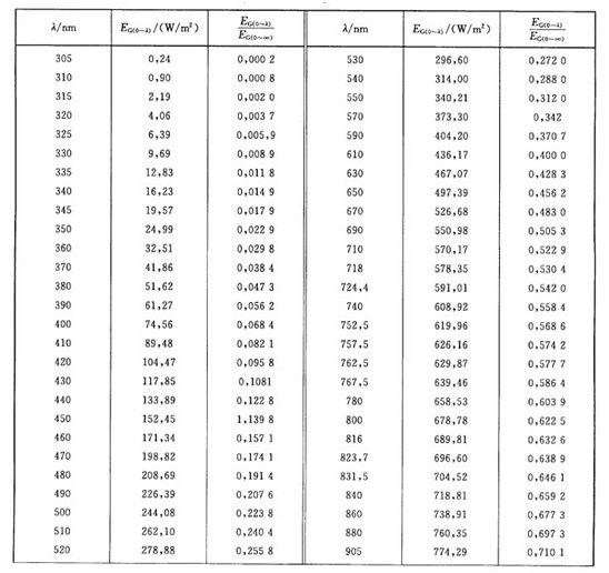 表B.1 海平面的日光光譜輻照度(摘自CIE出版物No.85:1989,表4)參數(shù):λ---以nm計的波長;E ——從0~λ積分得到的輻照度,以W/ m2計;E ——從0~∞積分得到的輻照度,以W/ m2計。